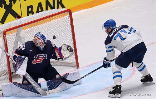 Leo Komarov of Finland (R) shoots at goal against Mike Condon of USA during IIHF Ice Hockey World Championship Group B match in St.Petersburg, Russia, May 9, 2016. Finland won 3-2. (Xinhua/Pavel Bednyakov)