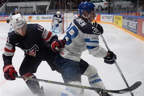 Tyler Motte (L) of USA vies with Juuso Hietanen of Finland during IIHF Ice Hockey World Championship Group B match in St.Petersburg, Russia, May 9, 2016. Finland won 3-2. (Xinhua/Pavel Bednyakov)