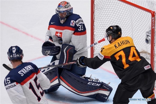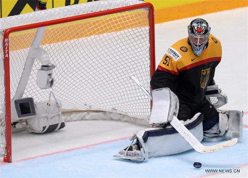 Timo Pielmeier of Germany catches the puck during IIHF ice hockey world championship Group B preliminary round game between Slovakia and Germany in St. Petersburg, Russia, May 10, 2016. Germany won 5-1. (Xinhua/Pavel Bednyakov)