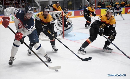 Julius Hudacek of Slovakia (C) catches the puck with his belly during IIHF ice hockey world championship Group B preliminary round game between Slovakia and Germany in St. Petersburg, Russia, May 10, 2016. Germany won 5-1. (Xinhua/Pavel Bednyakov)