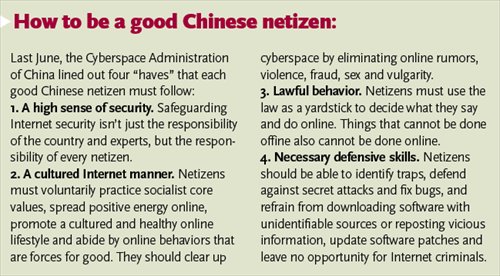 According to Lu Wei, director of the CAC, a good netizen should have high concern for Internet security, practice "socialist core values" and exhibit good Internet etiquette, among other requirements.