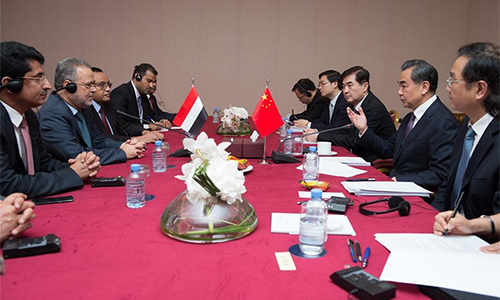 Chinese Foreign Minister Wang Yi (2nd R) meets with Yemeni Deputy Prime Minister and Foreign Minister Abdulmalik al-Mekhlafi (2nd L) in Doha, Qatar, May 11, 2016. Wang and al-Mekhlafi are in the Qatari capital for the 7th Ministerial Meeting of China-Arab Cooperation Forum, which is scheduled to open on Thursday.(Xinhua/Meng Tao)