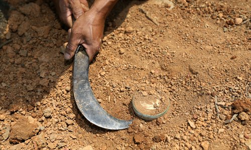 Wang Kaixue uses a sickle to push aside the soil. Photo: Cui Meng/GT