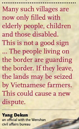 "Many such villages are now only filled with elderly people, children and those disabled. This is not a good sign," Yang said. "The people living on the border are guarding the border. If they leave, the lands may be seized by Vietnamese farmers. This could cause a new dispute," said Yang.