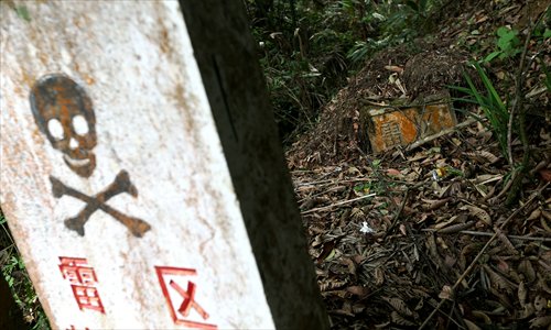 A sign in Laoshan Mountain indicates a minefield is nearby. Photo: Cui Meng/GT