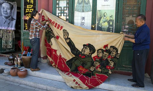 Vendors at a curio market in Beijing on Monday unfurl a 1969 banner depicting former Chinese leader Mao Zedong "inspecting the great army of the Cultural Revolution." China embarked on the revolution - a decade of tumult Mao launched to enforce radical egalitarianism - exactly 50 years ago (see editorial on page 14). Photo: AP