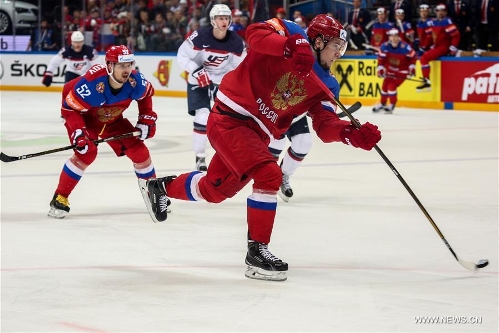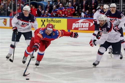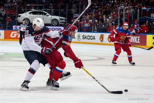 Sergei Kalinin of Russia (2nd L) vies with David Warsofsky of USA (R) during a game for the third place on IIHF Ice Hockey World Championship in Moscow, Russia, on May 22, 2016. Russia won 7-2. (Xinhua/Evgeny Sinitsyn)