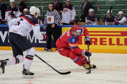 Alexei Marchenko of Russia (C) vies with Miles Wood of USA (L) during a game for the third place on IIHF Ice Hockey World Championship in Moscow, Russia, on May 22, 2016. Russia won 7-2. (Xinhua/Evgeny Sinitsyn)