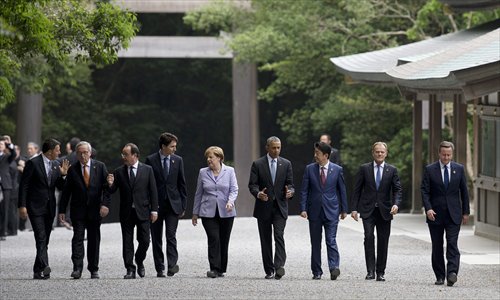 From left, Italian Premier Matteo Renzi, European Commission President Jean-Claude Juncker, French President Francois Hollande, Canadian Prime Minister Justin Trudeau, German Chancellor Angela Merkel, US President Barack Obama, Japanese Prime Minister Shinzo Abe, European Council President Donald Tusk and British Prime Minister David Cameron walk in a Shinto shrine in Ise in Japan on Thursday, as part of the G7 Summit. Photo: AP