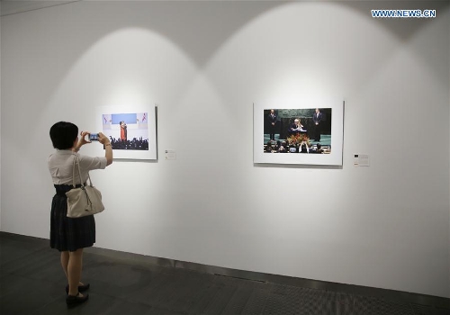 A visitor looks at a news photo from Xinhua News Agency during the China International Photographic Art Festival (CIPAF) held in Zhengzhou, capital of central China's Henan Province, May 26, 2016. 738 outstanding works selected from 110 thousand works from 88 countries and regions were displayed during the art festival, which will last for 8 days from May 26 to June 2. (Xinhua/Cai Yang)