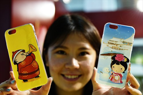 A woman shows off phone cases featuring characters wearing traditional clothing. Photo: IC