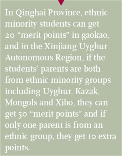 In Qinghai Province, ethnic minority students can get 20 "merit points," and in the Xinjiang Uyghur Autonomous Region, if the students' parents are both from ethnic minority groups including Uyghur, Kazak, Mongols and Xibo, they can get 50 "merit points" and if only one parent is from an ethnic group, they get 10 extra points.