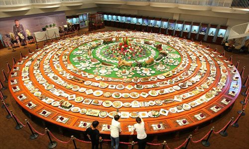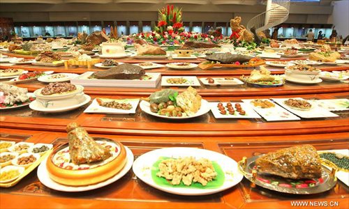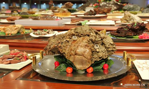 Photo taken on June 14, 2016 shows dish-like rare stones displayed on plates at the local rare stone museum in Hami, northwest China's Xinjiang Uygur Autonomous Region. In total 1,088 dishes made of rare stones like silicified wood, agate and bloodstone were displayed at the museum here Tuesday. (Xinhua/Polat)