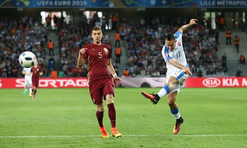 Marek Hamsik (right) of Slovakia takes a shot on goal during their European Championship Group B match against Russia in Lille, France on Wednesday. Photo: IC