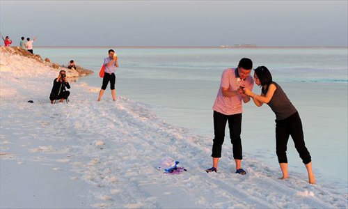 Visitors take photos by a salt lake in Lop Nur, northwest China's Xinjiang Uygur Autonomous Region, June 15, 2016. (Xinhua/Li Hua)