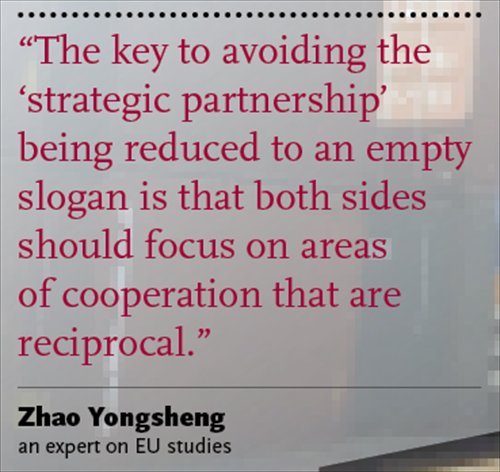 "The key to avoiding the 'strategic partnership' being reduced to an empty slogan is that both sides should focus on areas of cooperation that are reciprocal," Zhao Yongsheng, an expert on EU studies told the Global Times.