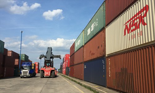 Vehicles operate beside Chinese containers at the railway container terminal in Lodz, Poland. Photo: Song Shengxia/GT