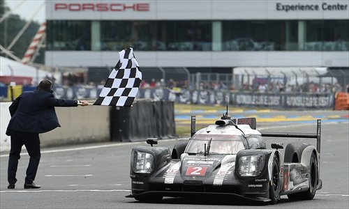 Switzerland's Neel Jani takes the Porsche 919 Hybrid over the finish line to win the 84th Le Mans 24-Hour endurance race on Sunday in Le Mans, France. Photo: AFP