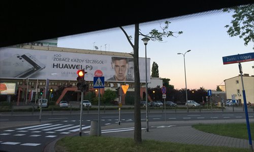 Poland's star striker and one of the world’s top football players Robert Lewandowski appears on Huawei billboards on the streets of Warsaw. Lewandowski is the ambassador for Huawei in Poland (as well as the Central-Eastern Europe, Baltic and Scandinavia Region). Photo: Song Shengxia/GT