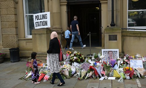 People leave flowers at a memorial for murdered MP Jo Cox outside Batley Town Hall as they arrive to vote in the EU referendum in Batley, northern England on Thursday. The bitterly-fought, knife-edge referendum could tear up the nation's EU membership and spark the greatest emergency of the bloc's 60-year history. Photo: AFP