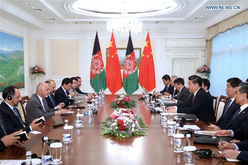 Chinese President Xi Jinping (R) meets with Afghan President Mohammad Ashraf Ghani in Tashkent, Uzbekistan, June 24, 2016. (Xinhua/Lan Hongguang)