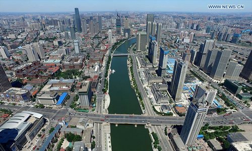 Photo taken on June 24, 2016 shows Jingang Bridge over Haihe River in Tianjin, north China. China's northern port city of Tianjin is getting ready for the Annual Meeting of the New Champions 2016, also known as the Summer Davos Forum, between June 26 and 28. (Xinhua/Yue Yuewei)