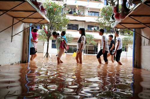 Residents wade through a flooded street on Friday in Luzhou, Southwest China's Sichuan Province. Photo: CFP