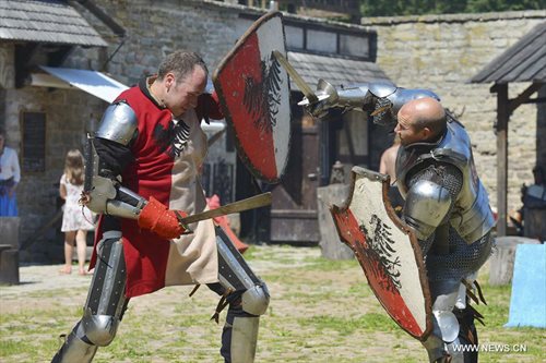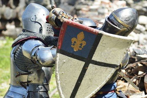 Teutonic knights fight during the Medieval Festival "Tall Hermann" in Narva, Estonia, June 25, 2016. Medieval Festival "Tall Hermann" was held at Narva Castle in northeastern Estonia. During the festival all visitors were involved to the medieval atmosphere in the Narva Castle. (Xinhua/Sergei Stepanov)