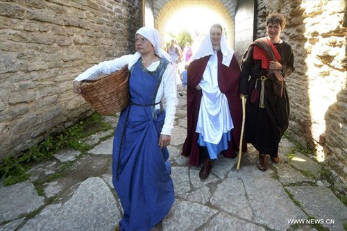 People in medieval dress participate in the Medieval Festival "Tall Hermann" in Narva, Estonia, June 25, 2016. Medieval Festival "Tall Hermann" was held at Narva Castle in northeastern Estonia. During the festival all visitors were involved to the medieval atmosphere in the Narva Castle. (Xinhua/Sergei Stepanov)