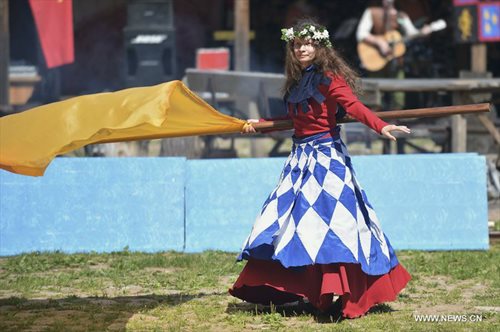 A woman in medieval dress dances with a flag during the Medieval Festival "Tall Hermann" in Narva, Estonia, June 25, 2016. Medieval Festival "Tall Hermann" was held at Narva Castle in northeastern Estonia. During the festival all visitors were involved to the medieval atmosphere in the Narva Castle. (Xinhua/Sergei Stepanov)