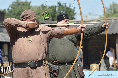 Medieval archers compete during the Medieval Festival "Tall Hermann" in Narva, Estonia, June 25, 2016. Medieval Festival "Tall Hermann" was held at Narva Castle in northeastern Estonia. During the festival all visitors were involved to the medieval atmosphere in the Narva Castle. (Xinhua/Sergei Stepanov)