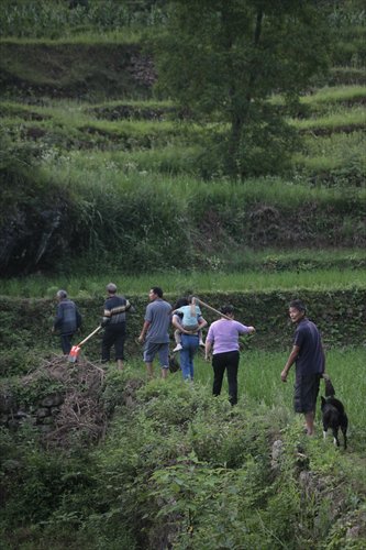 Villagers follow Huang's lead in digging the water channel. Photo: IC