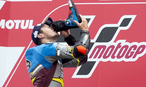 Jack Miller of Australia celebrates his victory by drinking from his boot during the podium ceremony of the Dutch Grand Prix MotoGP race in Assen, Netherlands on Sunday. Photo: IC
