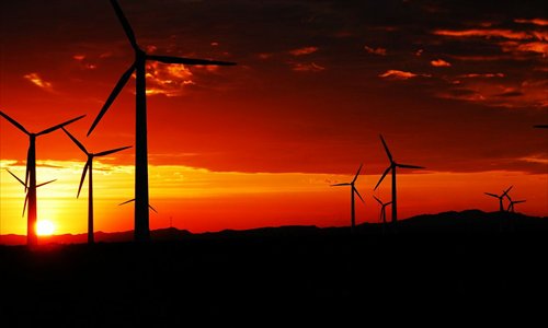 Wind turbines stand against the sunset at the Dabancheng wind power plant in Urumqi, Northwest China’s Xinjiang Uyghur Autonomous Region. The hundreds of windmills that together make up the plant not only currently represent China’s largest wind power base, but also serve as a major tourist attraction. Photos: Weibo account of???? (Xinjiang China)