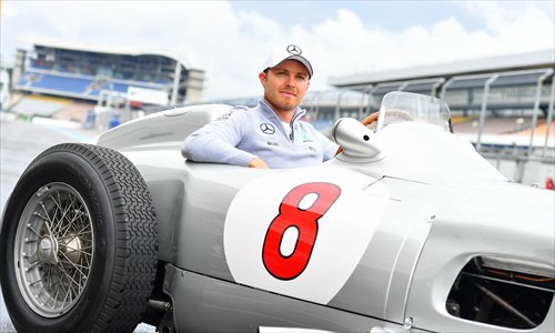 Formula One driver Nico Rosberg poses inside a historic Mercedes race car during the Hockenheim-Ring Media Day at the race track in Hockenheim, Germany on Tuesday. Photo: AFP