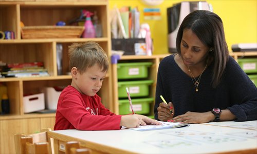 A teacher tutors a student at the House of Knowledge (HoK) International Kindergarten and Elementary School. Photo: Courtesy of HoK
