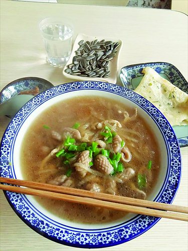 With only 16 yuan, you can get a set of dishes, including a bowl of buckwheat pasta (pictured above and known as "buckwheat mouse" in Yiwu), a slice of fried pancake and a small dish of tangyang, a kind of glutinous cake made of rice and brown sugar.