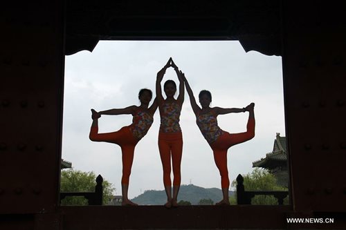 Yoga fans practise Yoga on Wudang Mountain in Shiyan City, central China's Hubei Province, July 3, 2016. (Xinhua/Cao Hongzhong)