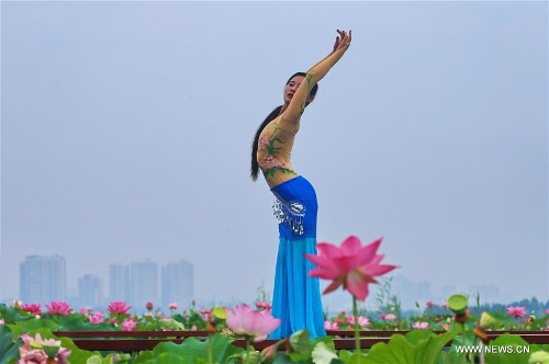 A girl dances near a lotus pond in Chuanshan District in Suining City, southwest China's Sichuan Province, July 2, 2016. (Xinhua/Zhong Min)