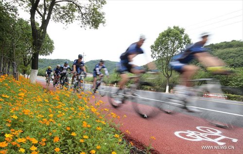 Cycling enthusiasts ride on a cycle path in Zhuji City, east China's Zhejiang Province, June 30, 2016. (Xinhua/Guo Bin)