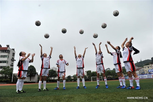 Students do football training on the field in Maoping Junior Middle School in Zigui County, central China's Hubei Province, July 2, 2016. (Xinhua/Wang Huifu)