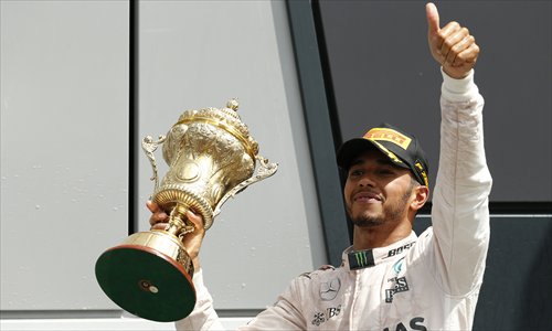 Mercedes' Lewis Hamilton celebrates on the podium with the trophy after winning the British Grand Prix. Photo: CFP