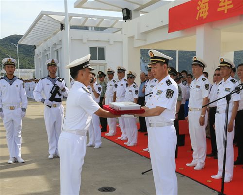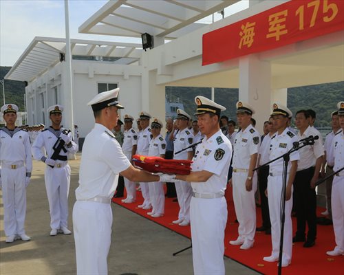 Li Hui (L), captain of the guided-missile destroyer Yinchuan, takes the navy ensign from the hands of Zhou Xuming, deputy commander of the South China Sea Fleet of the PLA Navy during a commissioning ceremony for the new guided-missile destroyer Yinchuan (hull number 175) at a naval port in Sanya.