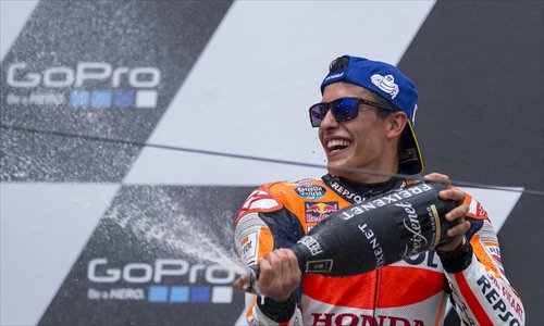 Honda rider Marc Marquez of Spain celebrates on the podium after winning the MotoGP race of the German Grand Prix on Sunday in Hohenstein-Ernstthal. Photo: AFP