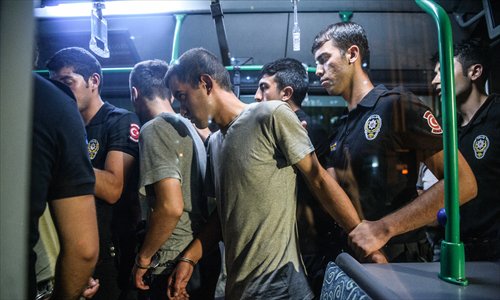 Turkish anti-riot police officers detain Turkish soldiers who allegedly took part in a military coup, as they leave the courthouse in Bakirkoy district in Istanbul on Saturday. Photo: AFP