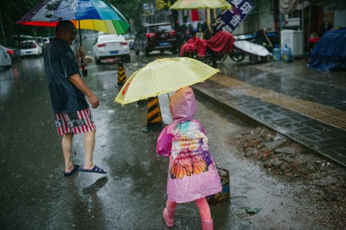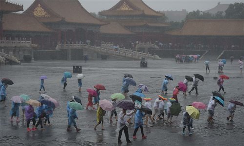 Tourists visit the Forbidden City in rain in Beijing, capital of China, July 20, 2016. Beijing's meteorological bureau issued an orange alert for rainstorm Wednesday noon.Photo: Xinhua