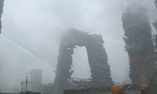 Buildings are shrouded in rain as seen from a car window in Beijing, capital of China, July 20, 2016. Beijing's meteorological bureau issued an orange alert for rainstorm Wednesday noon. Photo: Xinhua