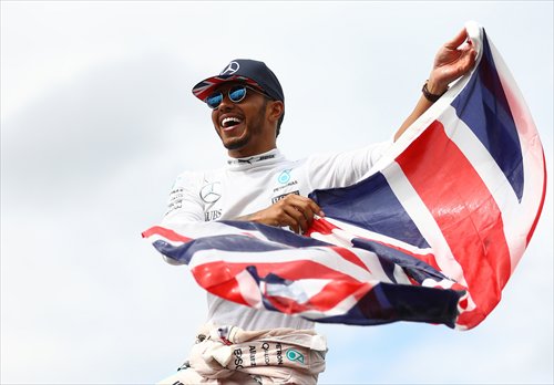 Mercedes driver Lewis Hamilton stands on top of a fence with a Great Britain flag to celebrate his win with the British fans during the British Grand Prix on July 10. Photo: CFP