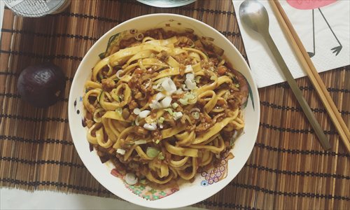 Born and raised in Beijing, Yang and his family prefer the Beijing-style - sautéed noodles with minced meat in soy bean paste, replacing the Chinese noodles with spaghetti. He also likes the Beijing-style fried shredded pancake, and replaces the pancake with pasta.