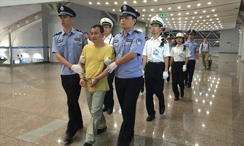 Chinese police repatriate Huang Haiyong, who is suspected of smuggling crude soybean oil into China and hid overseas for 18 years, on Sunday. Photo: CFP